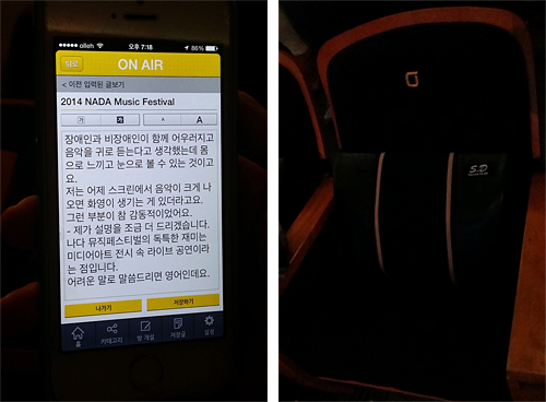 나다페스티벌 - 소리가 아닌 감각으로 듣다. 최하늘 (통통기자단, inuel1004@naver.com) 음악은 청각장애인에겐 항상 가까운듯하면서도 먼 존재였다. 그렇기에 주변에 음악 페스티벌이 있어도 청각장애인으로서 접근하기 쉽지 않아 시큰둥하기만 했다. 그러던 중 자주 연락을 하고 지내던 언니로부터 장애는 감각의 ‘부재’가 아닌 ‘차이’라는 취지로 만든 ‘나다 뮤직 페스티벌’이라는 축제를 함께 보러가자는 연락을 받았다. 소중한 ‘나(I)’가 함께 모여서 더 소중한 ‘다(ALL)’가 되는 Festival NADA ![]() <나다페스티벌이 열린 올레스케어(좌), 사회를 맡은 개그맨 홍록기와 KT아나운서 정혜신, 수화통역사 조성현> 2012년에 시작하여 올해 3회째로 맞이하는 나다 뮤직페스티벌(NADA Art & Music Festival)은 ‘예술’을 통해 장애인과 비장애인이 함께 즐기며, 인식을 개선하고, 장애인 아티스트와 뮤지션이 대중공연예술가로 성장, 발전하기 위한 다원(多元)예술축제이다. ‘숨겨진 감각 축제’라는 부제로 8월 3일부터 9일까지 총 7일간 열린 이번 축제는 장애인 문화예술과 그 방향성에 관한 포럼 ‘NADA Ideas(나다 아이디어)‘와 올레스퀘어 드림홀에서 미디어아트 전시와 진동의자를 설치하여 청각장애인도 음악을 즐길 수 있도록 마련한 음악공연, 홍대 네스트나다 나눔 콘서트 등 다양한 즐길 거리들을 마련하였다. 나는 8월 6일 저녁 7시 광화문 올레스퀘어 드림홀에서 열린 공연에 참석했다. 이 날 공연은 이동우, 갤럭시 익스프레스, 하수상 밴드와 함께 하였으며, 공연의 전반적인 진행은 개그맨 홍록기씨가 맡아 중간 중간 틈틈이 관객들 사이의 어색함을 풀어주기 위해 유머를 던지며 분위기를 띄워주었다. 관람객의 대다수가 비장애인들로, 그 틈 속에서 청각장애인 몇 명이 함께 하였는데, 수화통역사와 aud사회협동조합에서 제공한 실시간 문자통역 서비스(쉐어타이핑1))가 있어 공연에 참여하는데 어려움이 없었다. 또한 청각장애인석에 설치되어있는 진동스피커를 통해 소리의 움직임과 크기를 느낄 수 있어 어떠한 느낌의 음악인지를 파악할 수 있어서 정말 좋았다. ![]() <실시간 문자통역서비스 ‘쉐어타이핑’(좌), 진동스피커가 설치된 공연좌석(우)> 개그맨이자 시각장애를 가진 이동우씨의 노래를 시작으로 공연의 막이 올랐다. 총 3곡의 노래를 불러 주었는데, 그 중 홍록기씨의 결혼식 때 불러 주었던 노래인 ‘나만의 그대, 그대만의 나’란 곡의 가사가 느낌이 있고, 감동의 여운이 남는 음악이여서 가장 기억에 남고 좋았다. 두 번째 공연은 블루스 음악을 하는 하수상밴드(이기현, 김선미, 임정우)가 기타와 피아노 연주와 함께 자신들이 만든 자작곡을 불렀다. 하수상밴드에는 시각장애를 가진 멤버 이기현씨가 있었는데, 피아노를 치면서 노래를 부르는 것 뿐 만 아니라, 중간 중간 관객들과 대화를 하면서 공연의 분위기를 유머스럽고 재치있게 풀어주는 모습을 보여주었다. 나다페스티벌은 각 공연마다 암전공연이 준비되어있었는데, 암전공연은 시각을 차단함으로써 활성화되는 다른 감각을 통해 공연을 즐길 수 있도록 하는, 나다페스티벌의 특징을 가장 잘 보여주는 퍼포먼스인 것 같다. 하수상 밴드 역시 마지막에 암전 속에서 노래를 불렀는데, 진동스피커를 통해 느껴지는 울림을 통해 음악을 느낄 수 있어서 매우 좋은 시간이었다. ![]() <왼쪽부터: 이동우, 하수상밴드, 갤럭시 익스프레스의 공연 모습> 조금 아쉬운 점이 있다면 마지막 공연 전에 MC인 홍록기씨가 휘파람으로 노래를 불러주었는데, 진동스피커의자로 느끼기엔 미약해서 보청기를 통해 소리를 들어야 했던 점이었다. 마지막 공연은 락앤롤 밴드인 갤럭시 익스프레스(이주현, 박종현, 김희권)가 나와 신나는 노래를 들려주었다. 그런데 이때쯤엔 진동스피커의자가 열기로 인해 뜨거워져 의자에 오래 기대고 있기 힘들어서 조금 불편했지만, 진동이 커서 음악이 신나고, 얼마나 흥겨운 것인지 느낄 수 있어서 좋았다. 공연을 관람하면서 보니 20대~40대 연령층의 관객들이 많았다. 또한 가족이랑 온 사람들, 공연하는 가수를 열심히 카메라로 찍는 팬들의 모습 등 다양한 사람들의 모습을 볼 수 있었다. 이렇게 각양각색의 사람들과 함께 어울리며, 신나는 분위기속에서 음악 페스티벌을 즐겨보니 ‘이래서 사람들이 함께 모여서 공연을 관람하고 즐기는 구나’라는 생각이 들었다. 앞으로도 이러한 음악 페스티벌 축제를 통해 장애인, 그리고 비장애인 모두 다함께 음악을 즐길 수 있는 기회들이 많아졌으면 한다. 그러기 위해서는 나다페스티벌과 같이 장애인의 접근성을 위한 노력들이 필요할 것 같다. 이를 통해 서로 돕고, 발전하며, 행복을 느끼는 그러한 문화 페스티벌이 많이 생겨나길 바라본다. |