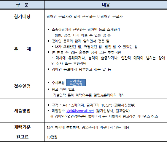 웹진『통 通』 "함께, 마주하기" 사례 모집 이번 2015년 웹진『통 通』‘함께, 마주하기’코너에서는 장애인 근로자와 함께 근무하고 계신 여러분들의 생생한 경험담을 공유함으로써 장애인 고용에 관심 있는 사업주 및 근로자들의 시선과 인식 개선을 꾀하고자 다음과 같이 사례를 모집합니다. ○ 공모요강 ![]() ※ 저작권, 출판 및 배포에 관한 모든 사항은 장애인직업안정원에 일임. ※ 웹진 취지에 맞는 내용으로 수정 및 보완 요청 있을 수 있음. ※ 자세한 사항은 장애인직업안정연구원 홈페이지(www.kjdi.re.kr) 참조. 장애인 근로자에 대해 일반적으로 근로가 불가능할 것이라든가 같이 일하면 불편한 것이라는 편견을 갖고 있는 경우가 많습니다. 그렇지만 보이지 않는 곳에서 비장애인 근로자보다 뛰어난 능력으로 자기 몫을 다하고 인정을 받고 있는 장애인 근로자가 많습니다. 이러한 장애인 근로자에 대한 소개를 통해 사업주 및 사원들에게 장애에 대한 올바른 관점을 제시하고, ‘장애인도 비장애인 못지않게’ 직장생활 등에서 맡은바 임무를 수행 가능한 능력을 지니고 있다는 인식을 확립할 필요가 있습니다. 이번 공모를 통해 장애인 근로자와 함께 근무하는 근로자가 직접 겪은 경험을 웹진 『통 通』의 ‘함께 마주하기’코너를 통해‘공유’함으로써 장애인 고용을 고려중인 기업의 사업주와 직원들의 근본적인 편견 및 부정적 인식을 제거하고 긍정적 인식을 확대해 나갈 수 있을 것으로 기대합니다. 주변에 함께 일하는 장애인 동료, 부하직원, 상사 등에 대한 경험 공유를 통해 사회전반에 걸친 장애인 인식개선 및 장애인고용에 대한 우호적 지지를 이끌어 낼 수 있도록 하여 장애인고용에 대한 사회적 공감대 형성에 여러분의 적극적인 참여와 기여를 부탁드립니다. |