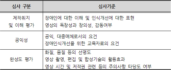 현재 실시되고 있는 ‘제2회 청소년 장애인식개선 캠페인 UCC공모전’ 함께하는 우리에게 OOO있다. 심사 기준에 대해 알려드리겠습니다. ![]() 무엇보다도, 심사 기준의 중요 부분은 장애에 대한 이해, UCC독창성(창의성)과 완성도, 메시지 전달력이 핵심입니다. 올해는 특히 수상작에 한해 공공기관이나 교육자료 등에 장애인인식개선 홍보물로 적극 활용할수 있도록 준비중에 있기 때문에, 공익성의 요건 및 교육자료의 요건으로 적합한지에 대해 중점적으로 볼 것 같습니다. 위의 심사 기준과 UCC공모전 안내문에 게재되어 있는 UCC형태에 관한 사항, 주의사항 등을 참조하시어 장애인식개선 캠페인을 통해 장애인에 대한 인식이 개선되는 좋은 기회가 될수 있도록 많이 참여 해 주시기 바랍니다. ※자세한 사항은 장애인직업안정연구원 홈페이지 혹은 해피빈에서 확인 하시기 바랍니다. ※ 제2회 청소년 장애인식개선 캠페인 UCC공모전 접수기한 연장안내 ‘5월 31일 금요일 마감’ → ‘6월 23일 일요일 24:00’ 로 연장됨
