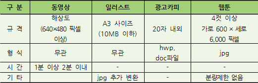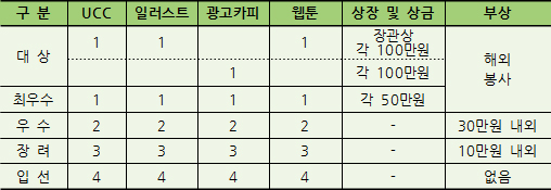 더 많은 우리들이 함께 걷는 세상 편집팀 2014 ‘작품공모전’으로 확대되다 올해로 3회째 맞이하게 되는 ‘UCC공모전’이 많은 청소년들의 관심과 성원으로 ‘작품공모전’으로 확대되었다. 이전년도까지는 장애인인식개선과 관련하여 ‘UCC’에만 한하여 공모하였는데, 올해부터는 3가지 부문이 더해져, 일러스트, 광고카피, 웹툰에 대한 작품공모전으로 확대되었다. 4가지 부문으로 작품공모의 확대는 장애인인식개선과 관련하여 청소년들이 우리 사회에 작지만 다양하고 참신한 생각을 던질 수 있는 기회를 제공할 수 있어, 보다 많은 청소년들의 적극적인 참가를 이끌어 낼 수 있을 것으로 기대한다. 2014 작품공모전은... - 제목 : 제3회 청소년 장애인 인식개선 캠페인 작품공모전 ‘함께하는 우리’ - 참가대상 : 중·고등학생 개인 및 단체(2인 이하) - 공모주제 : 「장애인에게 일이란 무엇일까요?」 - 공모분야 : 동영상, 일러스트, 광고카피, 웹툰 - 접수기간 및 일정 · 2014. 7.1(화). ~ 8. 31(일). 24:00(자정)까지 · 수상자 발표 : 2013. 9. 30(화). 13:00(정오 이후) ※ 홈페이지 게시(단, 발표일은 기관사정에 따라 변동 될 수 있음) - 접수방법 : 해피빈 접수(참가신청서, 동영상 파일 첨부) - 제출내역 ![]() ※ 한 팀이 각 부문별로 1작품 이내 접수 가능(4부문 각 1작품씩 접수할 경우 총 4작품 접수). ※ 각 부분별 접수 작품 중 중복 수상은 불가. ※ 전년도 수상자 중 대상 수상자는 참여 불가. - 시상기준 : 주제의 이해, 표현, 독창성, 감동, 완성도, 공익성, 교육 자료의 요건 등 - 시상내역 ![]() ※ 해외자원봉사: 1팀당 2명 이하(단, 기관사정에 따라 해외봉사 일정이 변동될 수 있음) ※ 각 상위 20위(80팀)까지는 자원봉사활동인증서 발급 예정 ※ 자세한 사항은 장애인직업연구원 홈페이지(www.kjdi.re.kr) 참조(6월 게시예정) 공모전 참여 이후 더 큰 성장이 기다리다... 2013년 수상한 작품의 경우 문화체육관광부에서 주관하고 한국장애인문화예술단체총연합회가 주최하는 「2013장애인문화예술축제」의 서울시청 광장 대형스크린에서 방영되어 호평을 얻었으며, 포털사이트 네이버·해피빈, 소셜 네트워크를 통해 트위터, 페이스북, 블로그 등에 소개되어 많은 네티즌들이 퍼 나르기를 하여 광범위한 홍보가 진행되었다. ![]() <2013장애인문화예술축제 서울시청 광장에서 방영된 청소년 장애인인식개선 UCC공모전 수상작> 또한 2013년 수상자 중 총 8명의 청소년이 장애인 리더와 함께 해외자원봉사에 참여하여, 4박 6일에 동안 캄보디아의 청소년을 대상으로 UCC제작 교육을 실시하고 공동제작을 추진하여 재능기부를 실천하였다. ![]() <2013 한·캄 UCC공동제작 발표회(캄보디아 로터스월드 청소년들과 함께)> 작품 수상으로 만족하고 끝나는 단순한 공모전이 아닌, 현대사회의 복합적 과제들(장애인 인식개선, 취약계층 지원, 국제교류, 장애인 리더양성)을 아울러 청소년과 장애인이 입체적으로 우리 사회의 과제들을 체험하고 깊이 있게 살펴 볼 수 있는 기회를 제공하였다. 올해에는 해외자원봉사뿐만 아니라 보다 많은 청소년들이 장애인인식개선 캠페인을 체험적으로 참여할 수 있도록 온·오프라인 워크숍(퀴즈쇼 등이 준비)도 개최하여 공모전 수상이외에서도 해외자원봉사 등에 참여할 수 있는 기회를 제공할 수 있도록 하고 있다. 2014년 작품공모전은 7월 1일부터 접수가 시작된다. 이번 공모전에서는 「장애인에게 일이란 무엇일까요?」라는 쉽지 않은 주제를 가지고 4가지 분야(UCC, 일러스트, 광고카피, 웹툰)에서 추진된다. 청소년들이 어떠한 참신하고 멋진 생각들을 우리 사회에 던져줄지 벌써부터 작품에 대한 기대가 모아진다. 아래 링크는 2013 UCC공모전 수상자들이 캄보디아 해외봉사에서 로터스월드의 캄보디아 청소년들과 함께 제작한 UCC작품들이다. 캄보디아의 무더운 날씨와 4박 6일이라는 짧은 일정, 언어·소통, 기자재의 부족함 등 해외봉사 특성상 다양한 난제가 있었음에도 불구하고 양국의 청소년과 장애인 리더들이 열심히 참여하여 만들어 낸 작품이다. 또한 이렇게 양국의 청소년들과 장애인 리더가 열정을 쏟아 부어 좋은 결과물을 낼 수 있도록 고용노동부, 신한은행, 해피빈의 전폭적인 지원과 로터스월드의 협조가 없었다면 불가능하였을 것이다.