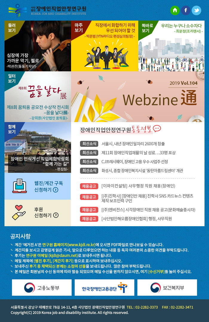 사단법인 장애인직업안정연구원 웹진 통 104호 똑바보기 : 우리는 누구나 소수자다 -최문정(프리랜서)- 마주보기 : 직장에서 화합하기 위해 우선 되어야 할 것 - 박준범 PD (YTN 라디오 편성팀장)- 둘러보기 : 심장에 가장 가까운 악기, 첼로 -박관찬(통통기자단, p306kc@naver.com)- 일터보기 : 제8회 꿈틔움 공모전 수상작 전시회 –꿈을 날다展- -편집팀-